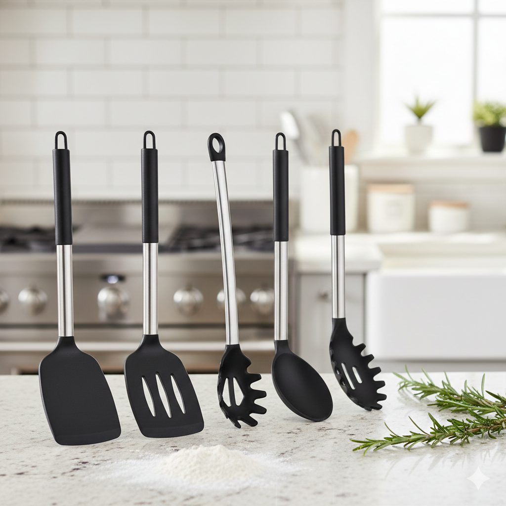 We noticed a problem in most kitchens: drawers overflowing with cheap plastic tools that melt, or metal utensils that ruin expensive non-stick pans. That’s why we created the Essential 6-Piece Silicone Set. We stripped away the fluff and focused on the six core tools every home cook actually needs, engineered with premium materials and a modern aesthetic.